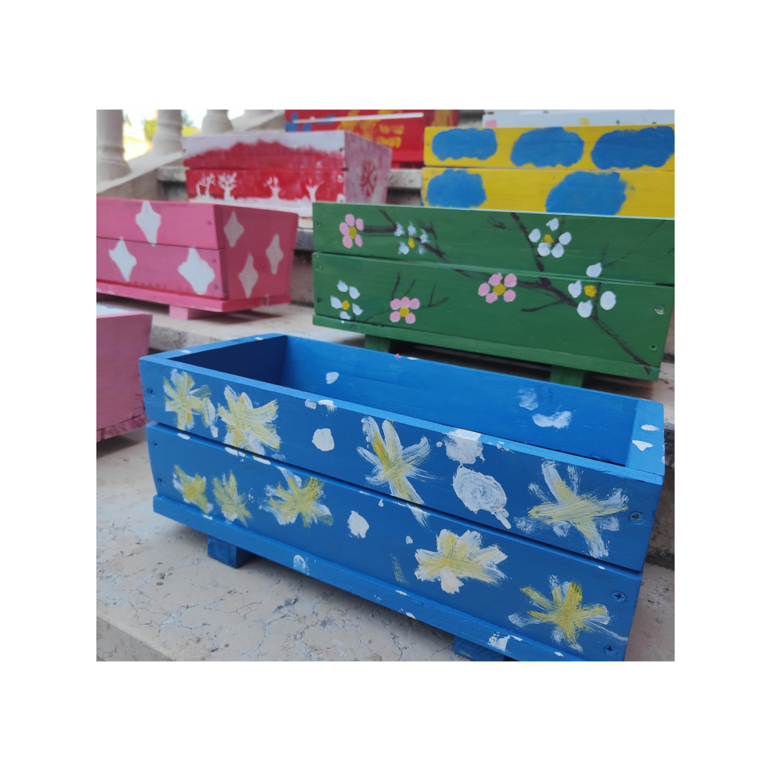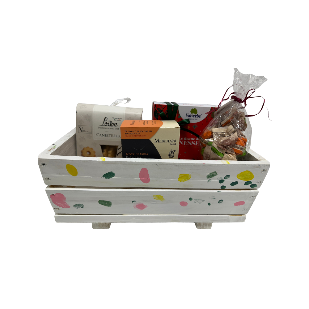 Originale confezione natalizia all’interno di una fioriera in legno decorata a mano.